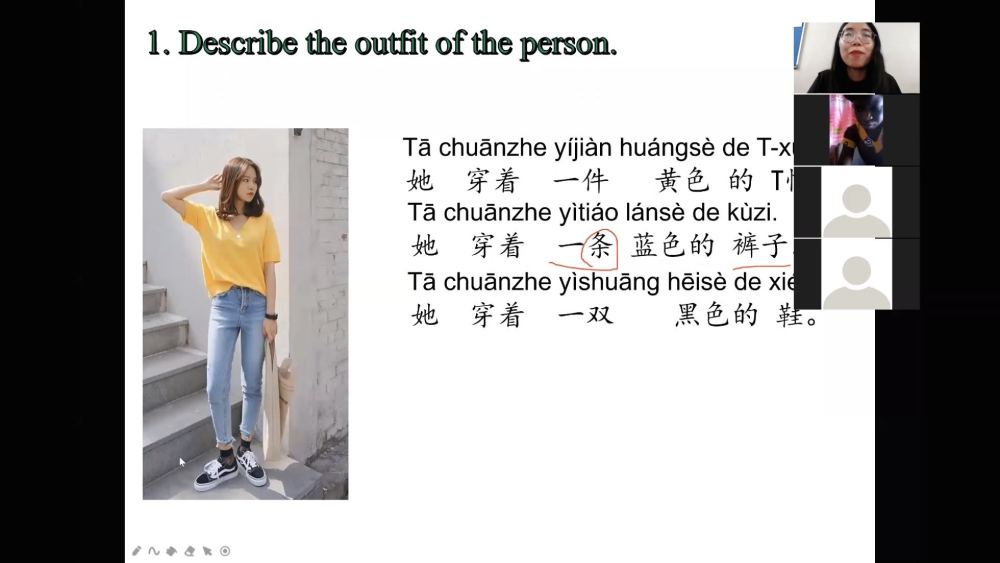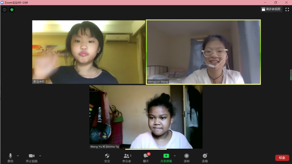 一个小时的课程并不轻松,有口语、语法和词汇等内容,约10名学生在线上课。穆宗加仍像面对面那样,时不时“点名”学生回答问题。课程的最后,穆宗加问她的学生们:“你们爱我吗?”“爱!老师再见!”学生们回答。