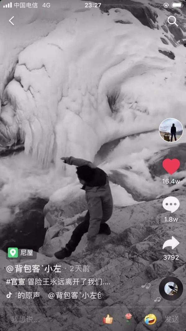 就是这个可爱的“冒险王”,遇难了。他的快手个人账号在12月26日更新消息说:“2020年12月20日,我的哥哥,你们的老王,永远地留在了这个他最喜欢的瀑布里。他这一生痴迷于冰川,同时献身于冰川,这里是他最好的归宿。”这条视频已有近715万播放量,粉丝们都不愿相信“老王”真的走了。