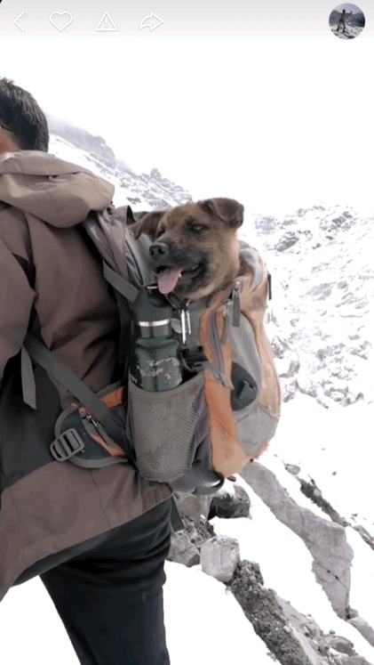 ·王相军背着他的小狗“土豆”爬雪山。