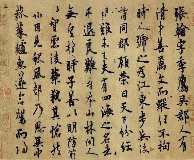 释文:“张翰字季鹰,吴郡人。有清才,善属文,而纵任不拘,时人号之为‘江东步兵’。后谓同郡顾荣曰: ‘天下纷纭,祸难未已。夫有四海之名者,求退良难。吾本山林间人,无望于时。子善以明防前,以智虑后。’荣执其(疑缺”手”字)怆然,翰因见秋风起,乃思吴中菰菜鲈鱼,遂命驾而归。”