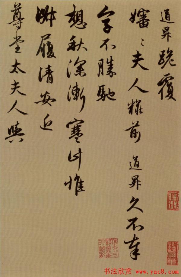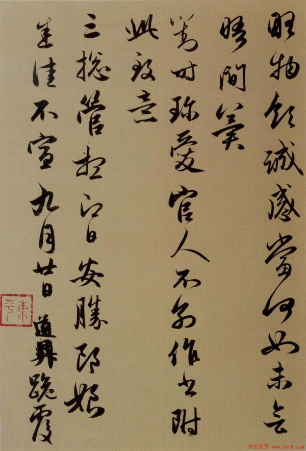 南方水多,物产丰盈,尤其是鱼,就连赵孟頫、管道昇夫妇在向婶婶问安之时也不忘奉上廿尾鱼干,而这些馈赠之物被悉数记录在了《秋深帖》中。此为管道昇写给婶婶问安、馈赠的家信,笔力扎实,体态修长,秀媚圆活,畅朗劲健,多数专家认为此书信乃赵孟頫代为书写。