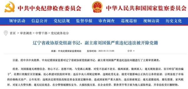 继2021年第一个工作日连打4虎之后,中央纪委国家监委今日再次集中发力,公布了3起违纪违法处分通报。其中,辽宁省政协原副主席刘国强格外引人注目。