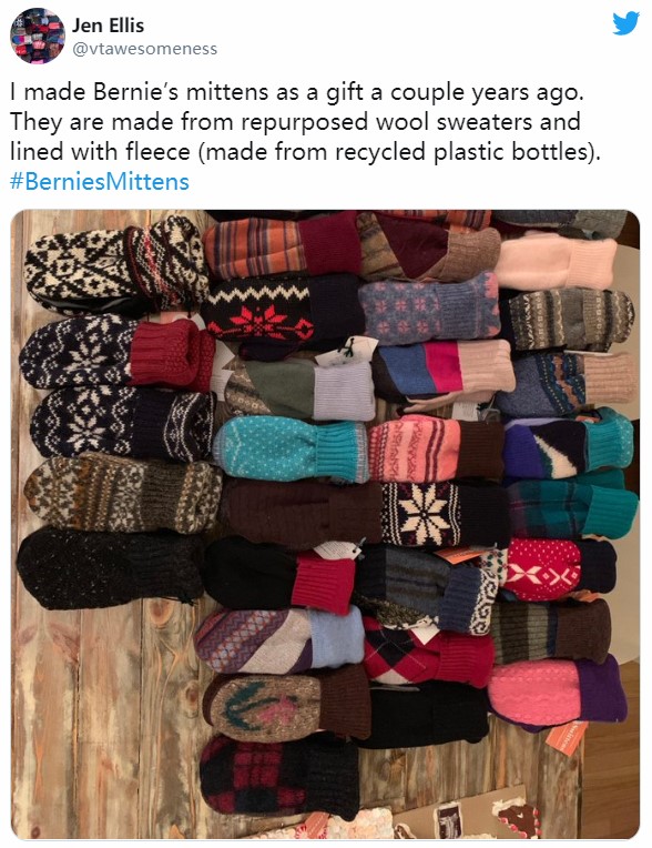 网友们还注意到了桑德斯的“朴实”手套,《华盛顿邮报》等媒体还挖掘出手套背后的暖心故事。原来,这副手套是佛蒙特州一位名为珍·埃利斯(Jen Ellis)的教师给桑德斯织的。埃利斯说,她一直很尊敬桑德斯,因为认同他对免费教育的看法。2016年,桑德斯竞选民主党总统候选人失败后,她用旧毛衣给桑德斯织了一副手套,并给他寄了过去,没想到这副手套这么受桑德斯喜爱。