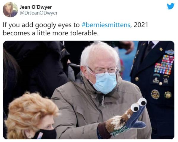 网友说,如果给桑德斯的手套加上眼睛,2021年似乎没那么不能忍受了。