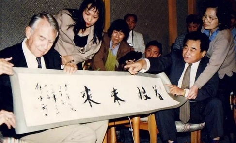 1997年10月17日,韩德彩(右二)、朱容芬(右一)夫妇在上海天益宾馆会见费席尔(左一)。 图片由受访者提供
