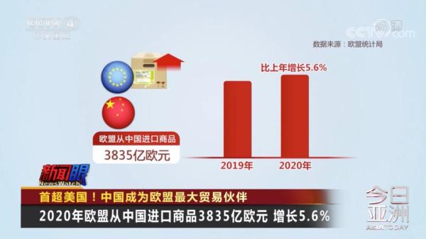 欧盟统计局2月15日发布的外贸数据显示,2020年欧盟27国与中国货物贸易在疫情中逆势双向增长,中国首次取代美国成为欧盟最大贸易伙伴。数据显示,2020年欧盟从中国进口商品3835亿欧元,比上年增长5.6%;向中国出口商品2025亿欧元,增长2.2%。