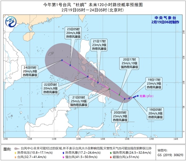 据中央气象台消息,今年第1号台风“杜鹃”(热带风暴级)的中心,今天(2月19日)凌晨5点位于菲律宾马尼拉东南方约1410公里的西北太平洋洋面上, 中心附近最大风力达到8级(20米/秒),七级风圈半径120至200公里。