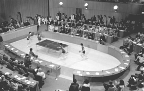 1972年4月,中国乒乓球代表团在联合国总部会议大厅进行友谊赛。资料图片