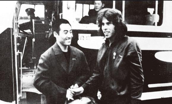 1971年4月4日,美国乒乓球运动员格伦·科恩无意间坐上了中国乒乓球队的训练大巴,中国乒乓球运动员庄则栋主动上前与其交谈。资料图片
