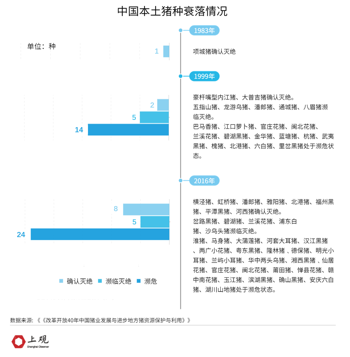 2004年起,国家启动第二次全国畜禽遗传资源调查。其结果显示,我国有125个猪品种,其中地方品种88个,85%左右的地方猪群体数量呈下降趋势,31个品种处于濒危和濒临灭绝状态。