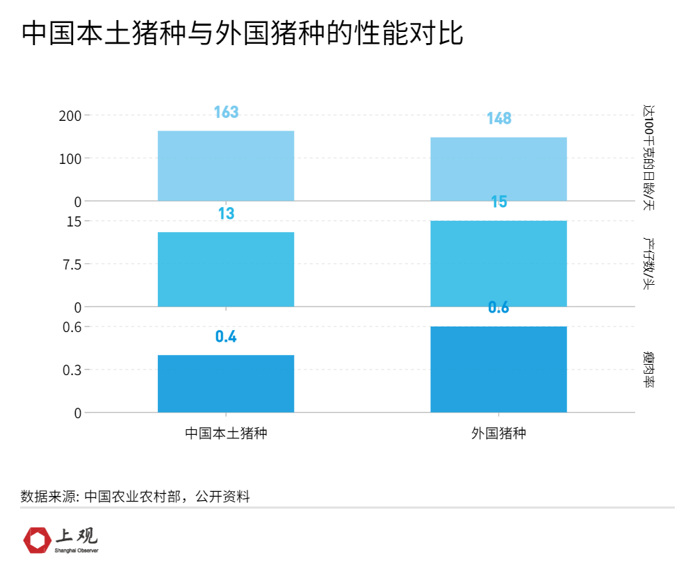 上世纪80 年代引入了工厂化养猪的理念后,外国猪种的优势愈发明显。中国本土猪种达到100千克(即成年体重)的时间比外国猪种长半个月,产仔数和瘦肉率却比外国猪种低。