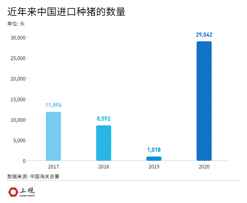 但形势大好的数据里隐藏着一个隐患:2020年,中国种猪进口量也创史上新高,达到29042头。