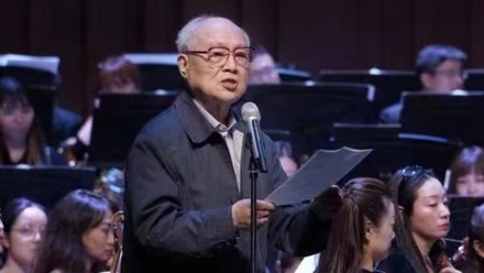 题图说明:4月29日,91岁作曲家吕其明出现在“红色情怀”系列音乐会上 图片来源:上海爱乐乐团提供