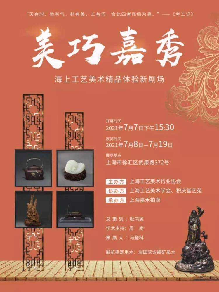 7月8日至7月19日,一大批技艺精湛的海派工艺美术品在武康路372号上海积庆堂艺苑集中展示。由上海工艺美术行业协会主办的“美巧嘉秀——海上工艺美术精品体验新剧场”上,展出近百件中国工艺美术大师、中国木雕艺术大师、中国玉雕艺术大师等创作的工艺美术精品。