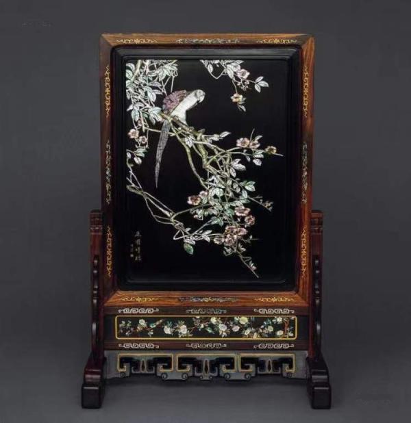 中国工艺美术大师、国家级非遗项目代表性传承人陈明伟的《庭园晴窗》台屏,采用大叶紫檀、大红酸枝材质,镶嵌新西兰鲍鱼贝、绿鲍贝、蓝鲍贝、黑蝶贝以及牛骨、黄杨木、瘿木等材料。作者以极细小的螺钿片拼镶成了一幅花鸟图案,并用阴刻线条来雕琢,组成了一幅花团锦簇、鸟语鸣春的庭园晴窗图。螺钿镶嵌图案在光线照射下闪现出翠羽、美玉、紫霞般的光芒。