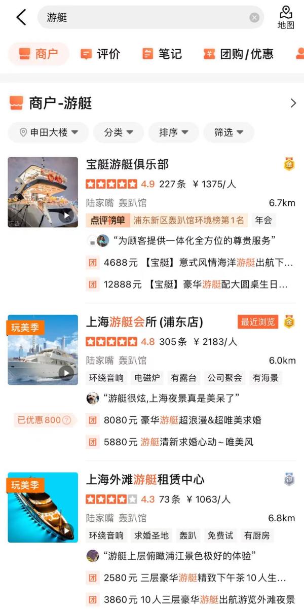 打开“大众点评”搜索“游艇”,就能找到多家游艇俱乐部,经营包括夜游浦江、私人聚会、“轰趴”等项目在内的各类娱乐和餐饮服务。