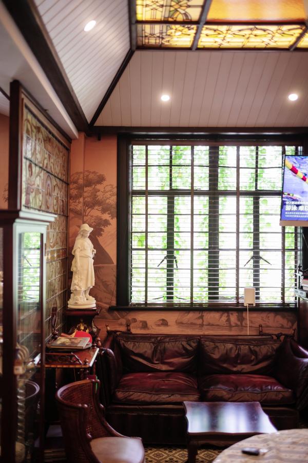 花纹地砖和墙面,整齐悬挂的镜框,精致的直角背沙发,浓郁的英伦风情让人仿佛走进贝克街221号福尔摩斯的家。