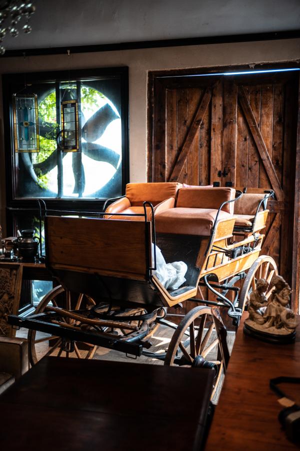 展厅的一角居然还有一辆“敞篷”古董马车。零件看起来保存得都很完好,大概套上缰绳就能被马拉动跑起来。