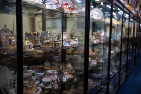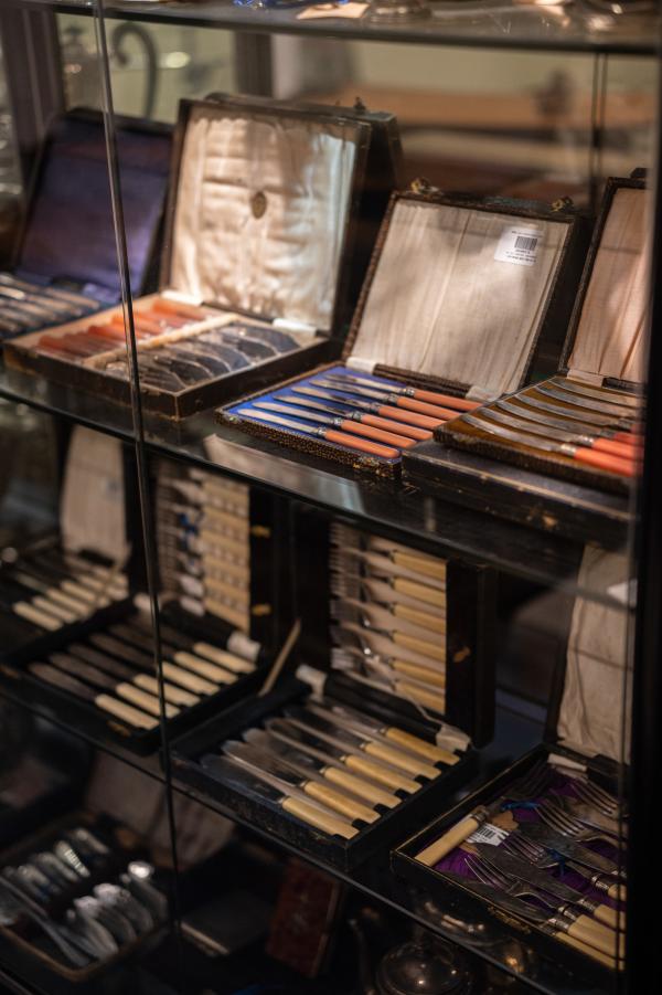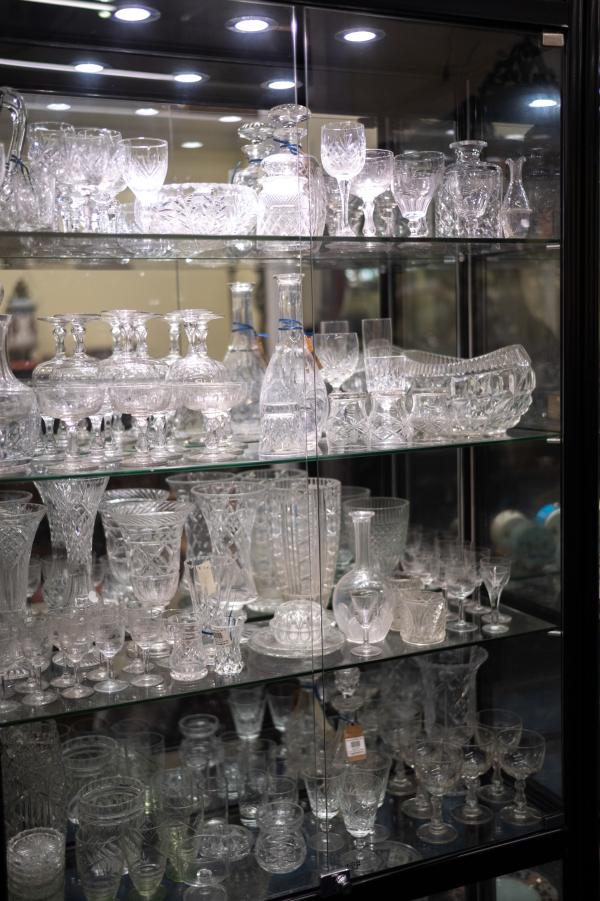 进入下一个展厅,最引人注目的是长达十几米的一大排陈列柜,里面分门别类地摆放了各种餐具。英国的骨瓷杯盘,东欧的水晶器皿,还有成套的银质餐刀餐具,让人叹为观止。
