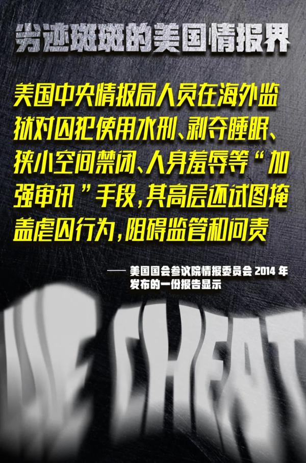 虐囚——美国国会参议院情报委员会2014年曾发布报告,详细描述了中情局在审讯囚犯时如何刑讯逼供,其使用的“加强审讯”手段包括水刑、剥夺睡眠、狭小空间禁闭、人身羞辱等。报告还指出,中情局试图掩盖虐囚行为并妨碍监管。该委员会时任主席黛安娜·范斯坦直言:中情局的行为是美国历史上的一个污点。