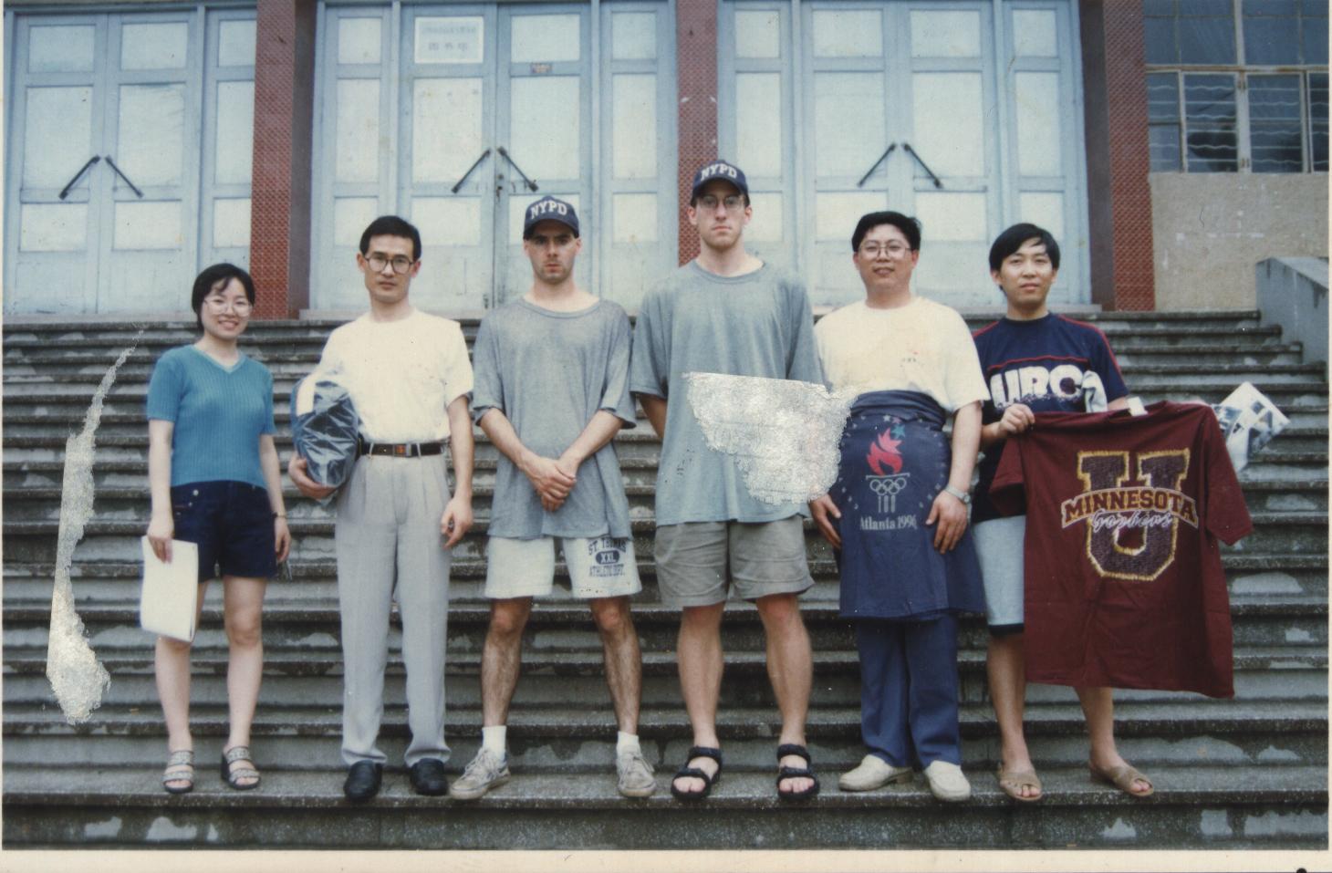 1998年,何伟(左三)离开涪陵前,在涪陵师专图书馆门前的合影。(受访者供图)