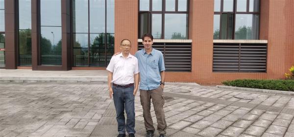 2021年,在长江师范学院教学楼前,何伟(右)与李雪顺合影。 李楚悦 摄