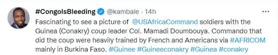 从众多推特用户的转发情况看,最先披露这一消息并引发大量传播的,是来自一位自称“泛非主义者”的加纳网络意见领袖,他在发布该图时表示:看到这次政变的带头人马马迪·敦布亚和美军驻几内亚士兵在大使馆前的合影,可真是太让人迷惑了。
