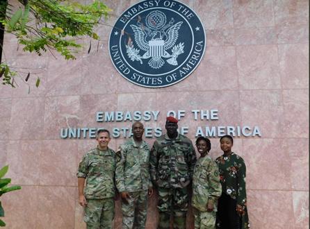 6日,社交媒体平台风传一张政变领导人马马迪·敦布亚和美军军官在美国大使馆门前的合影,发文者称这次政变背后有美国的“影子”。