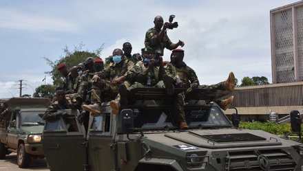 9月5日,几内亚军人乘车行进在几内亚首都科纳克里卡卢姆区的街道上。图源:新华社