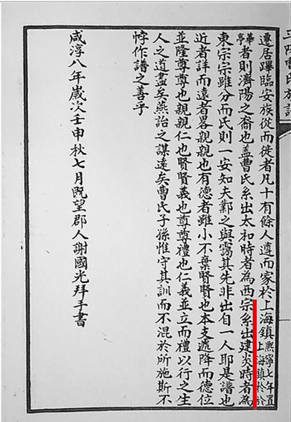 上海一位著名史学研究者周敏法,在《上海地方志》2018年第1期撰写《上海建镇年代考证辨》一文中,披露并详细论述了有关浦东高行镇新发现的《平阳曹氏族谱》卷首的《范溪旧序》,记载了“熙宁七年置上海镇于华亭”(红线)的重磅文献资料,这是当今唯一载明上海镇确切年代的宋代史料,与上面三个明清史料前后呼应,形成了一条证据链,解决了上海建镇的历史悬案。
