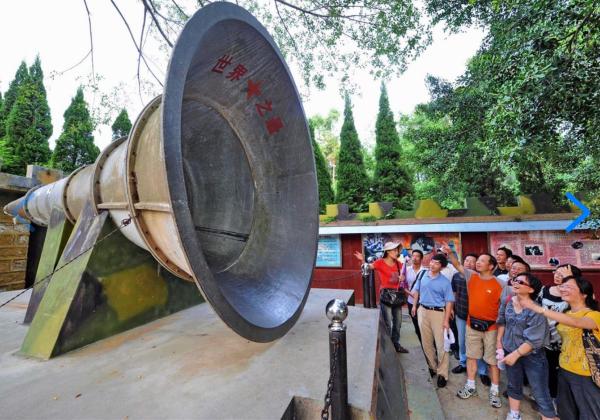 2009年8月,游客在大嶝岛战地观光园参观被称为世界最大的军事广播喇叭。新华社发