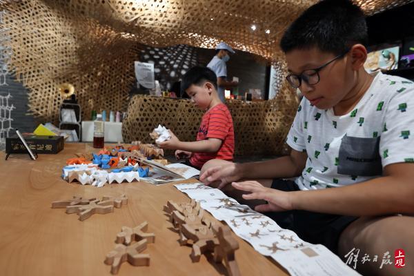 2021年10月6日,小朋友在智慧湾学习插花、拼图,在创意书房看书。