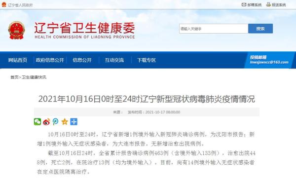 10月16日0时至24时,辽宁省新增1例境外输入新冠肺炎确诊病例,为沈阳市报告。无新增本土病例。