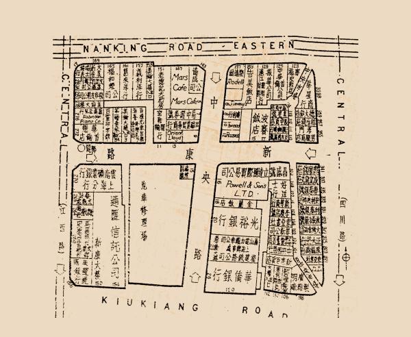 再说回1930年,四幢建筑完成现状后,街坊格局基本定型。在1947年10月出版的《上海市行号路图录》上,我们可以看到本街坊详细的商户布局。沿四川路的两幅地块,在南京东路转角和九江路转角的两处入口处,都标着“中央市场”。中间有一条宽敞的廊道,将南北两幢“中央市场”串联为一个整体。不过,其南半部分约在1999年前后拆除,原址新建了一幢14层高的“中央大厦”。现在中央大厦的门楣上,还贴着英文铜字“CENTRAL MANSION”,入驻着银行、保险、证券、基金等金融机构。