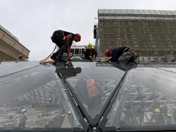 - 2021年5月外滩中央广场十字内街顶棚上,三名工人正在安装三角玻璃。