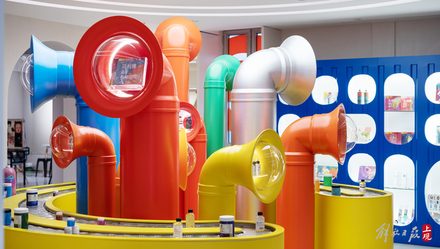 步入更深处空间是一个童装品牌的专柜,穿过专柜后面色彩缤纷的长廊,视野瞬间开阔,是幸福集荟打造的一个艺术书店和文创产品空间。