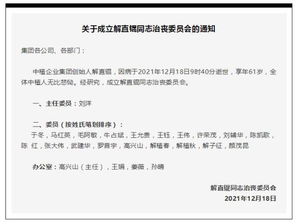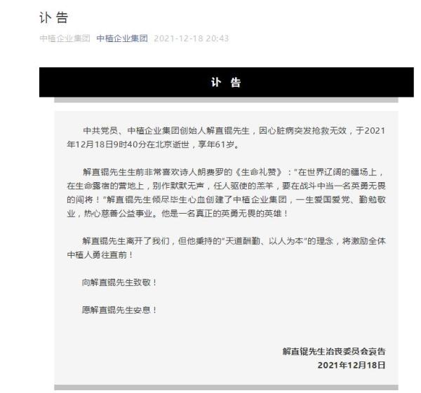 中植企业集团微信公众号12月18日晚间发布讣告:中共党员、中植企业集团创始人解直锟先生,因心脏病突发抢救无效,于2021年12月18日9时40分在北京逝世,享年61岁。