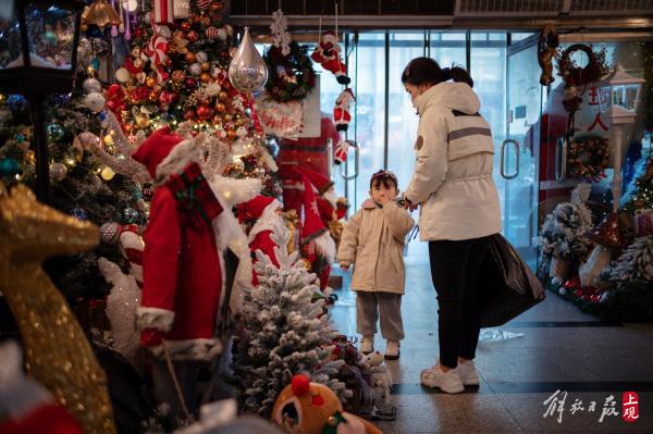 五彩缤纷的圣诞装饰搭建起了好看的景观,一位小朋友站在店门口,有些“乐不思蜀”。