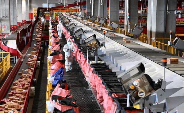1月13日,在位于西安国际港务区的京东“亚洲一号”园区内,工作人员分拣快递。