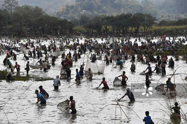 1月13日,印度古瓦哈蒂郊区,村民在博加利比胡参加社区捕鱼活动。