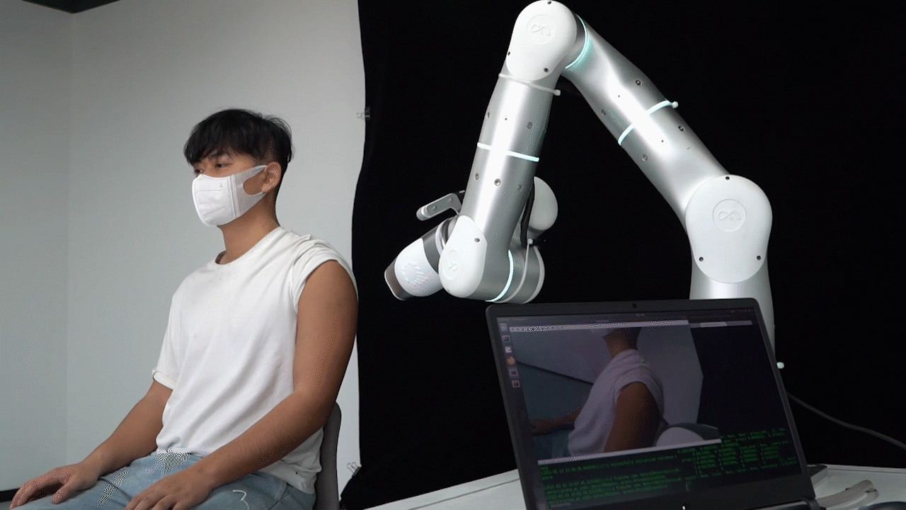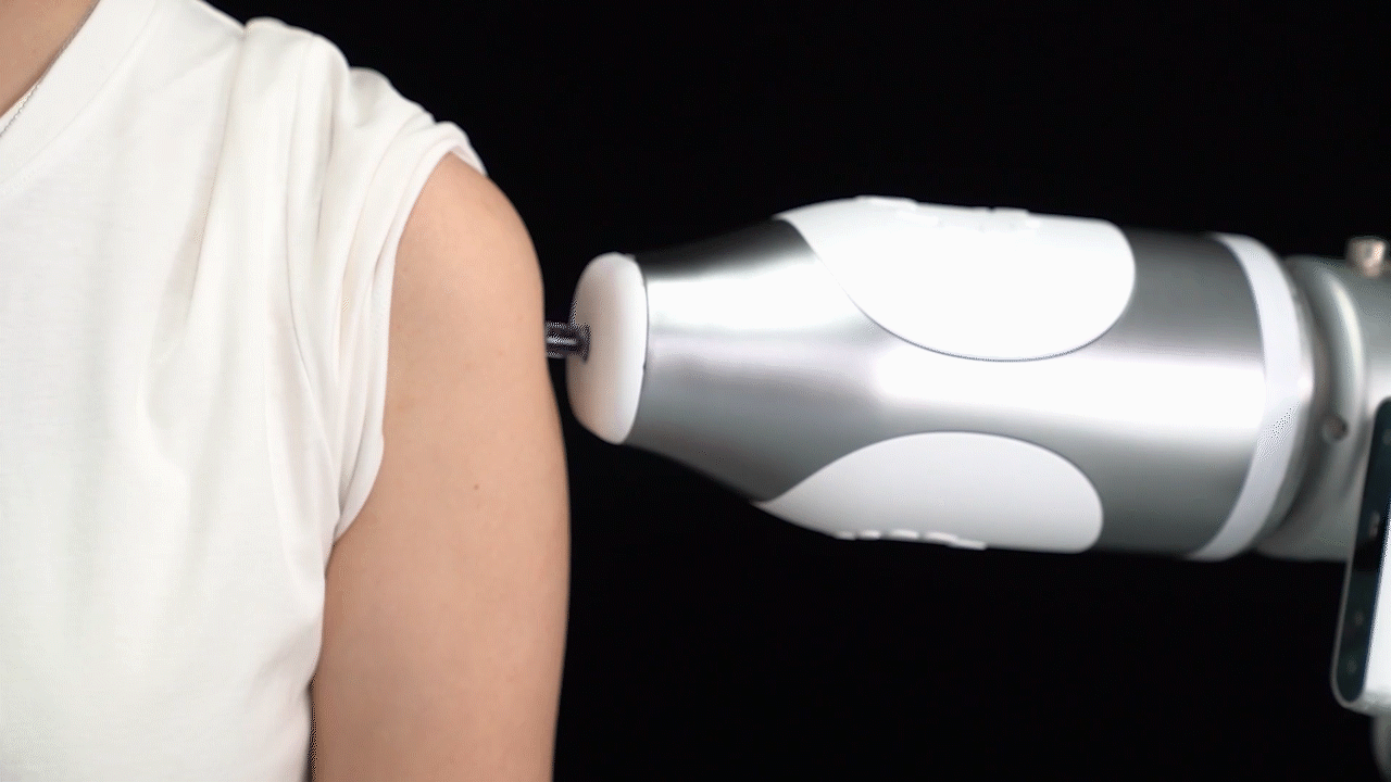 无针注射,疼吗?通常来说,注射器头部与皮肤表面贴合越密切、接触角度越垂直,则注射效果越好,而且痛感越小。在注射过程中,机器人“后羿”机械臂应用精准力控算法确保注射器密切贴合人体皮肤、与人体皮肤表面垂直,并持续保持对人体皮肤表面一定的按压力,快速、无痛地完成疫苗注射。