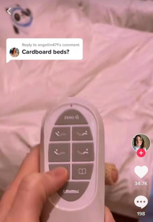 萨默·布里彻随后拿着遥控器,演示起房间内的高科技床铺。视频中,她拿起有8个按钮的床用遥控器,向观众展示床垫可以升高、降低到各种位置,“电视模式”能让床头调整到接近沙发的状态,看起来极度舒适。她还拍摄了自己躺在睡袋里的场景,介绍自己处在零重力模式,这让她非常震撼。