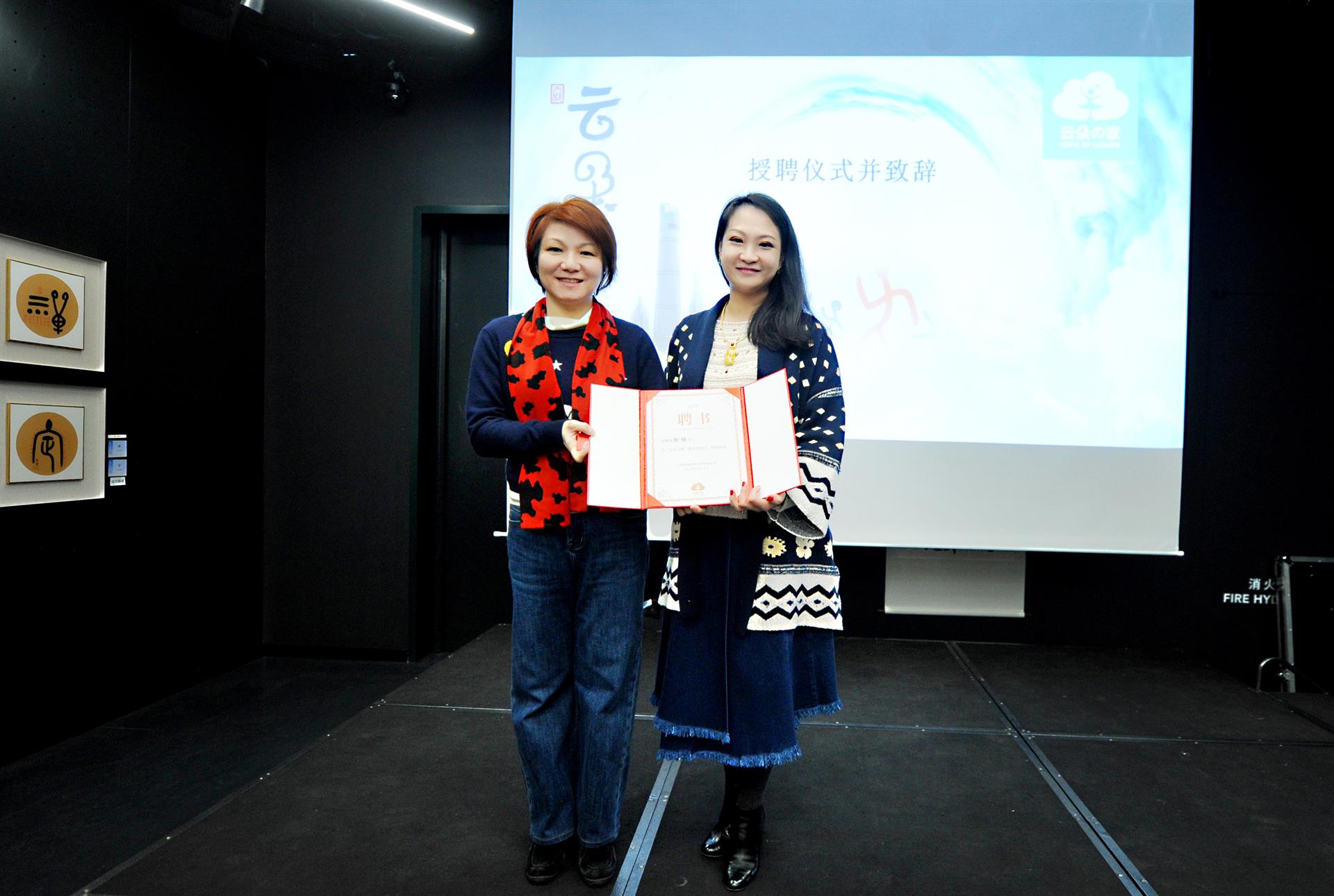 徐梅(左)受聘“云朵之家”国学总顾问,接受云朵之家创始人刘姝彤(右)颁发的聘书。