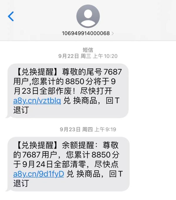 小陈(化名)回忆了自己的经历:去年9月22日,其尾号为“7687”的手机号收到一则短信息,发件人号码是106949914000068,内容是“【兑换提醒】尊敬的尾号7687用户,您累积的8850分将于9月23日全部作废!尽快打开a8y.cn/vztblq兑换商品,回T退订”。该短信9月23日再次出现,只不过“清零日期”变成了9月24日。
