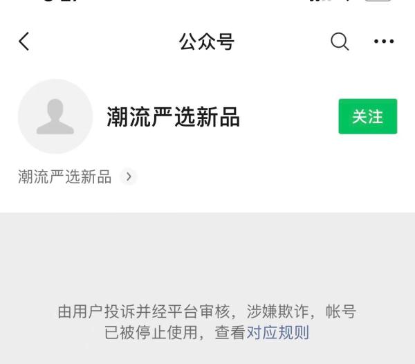 小陈又通过微信支付的账单找到这笔299元的付款记录,发现收款方为“河南零初网络科技有限公司”。该公司的微信公众号“潮流严选新品”已被微信官方叫停,原因是“由用户投诉并经平台审核,涉嫌欺诈”。
