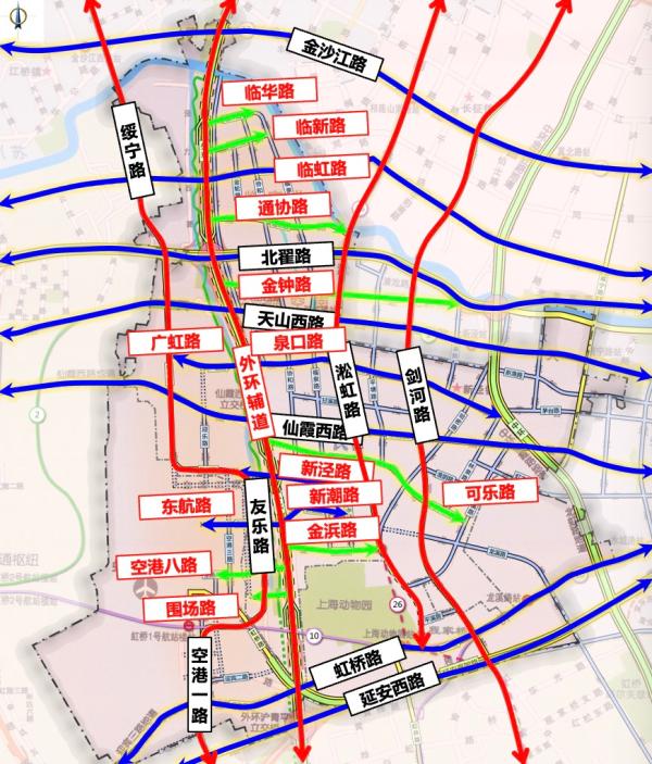 道路路网方面,东虹桥区域的绥宁路-友乐路-空港一路、淞虹路、剑河路等3条纵向主干道和金沙江路、北翟路、天山西路、仙霞西路、虹桥路、延安西路等6条横向主干道将构成通达的配套路网。外环抬升及配套工程实施后,将新增1条纵向道路和12条横向道路,形成更加密集的“四纵十八横”路网结构,实现东虹桥区域道路交通脉络的全面升级。