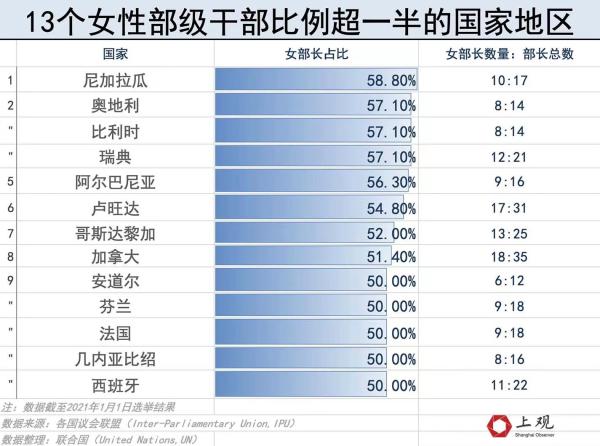部级(及以上)领导人中女性比例超过半数的国家,欧洲国家占了8个。丹麦首相、芬兰和冰岛总理均为女性,挪威的前首相也是女性。瑞典女性参与国会的比例高达47%,部长级的女性数量也最多。