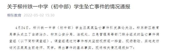 4月24日,柳州铁一中学(初中部)学生汪某某坠亡事件引发舆论关注。柳东新区教育局牵头成立了由综治办、柳东公安分局、法规处、应急管理局等部门联合组成的坠亡事件调查组(以下简称调查组)。调查组通过对事件相关监控视频逐一排查、现场勘验、实地走访询问汪某某生前老师、同学,得出事件的基本事实。现将相关情况通报如下: