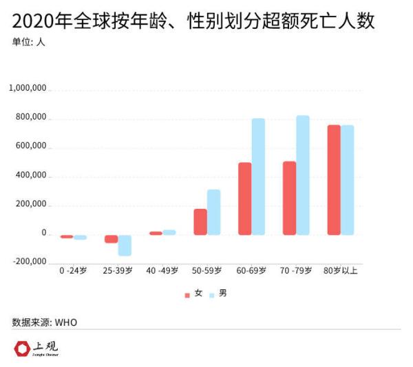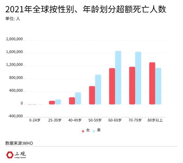 而按年龄和性别划分的超额死亡率,全球男性的死亡总人数高于女性,其中男性超额死亡约848万,占比57%,女性则约为643万人,占比43%,并且这个差距在老年人中更高,尤其是60-79岁的人群。