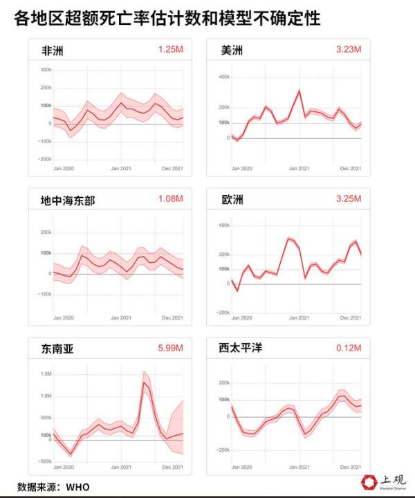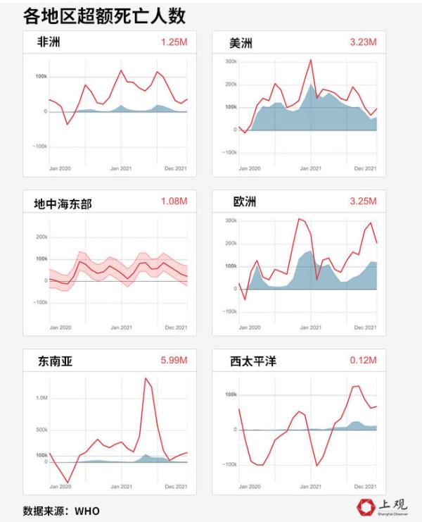 从地区分布来看,大部分的超额死亡集中在东南亚(599万)、欧洲(325万)和美洲(323万),这些地区总计占世界的84%,其中东南亚地区最多。